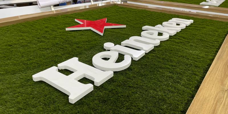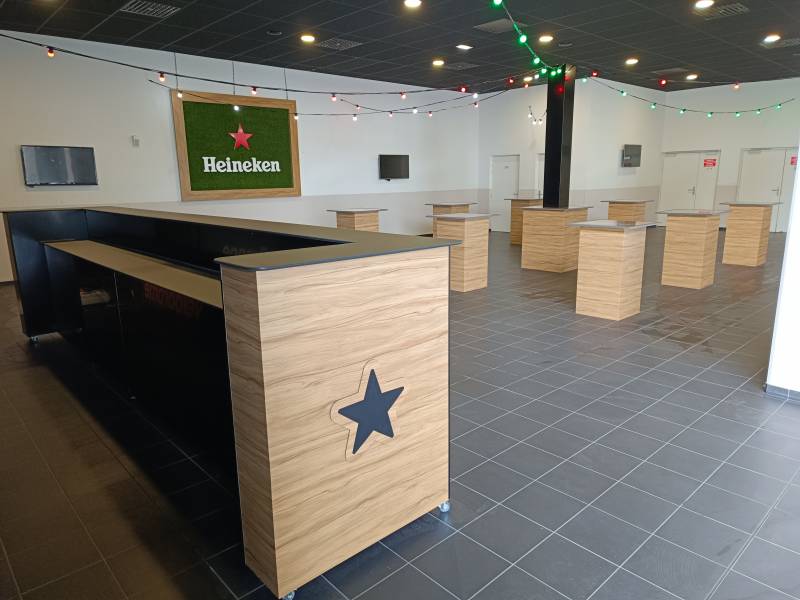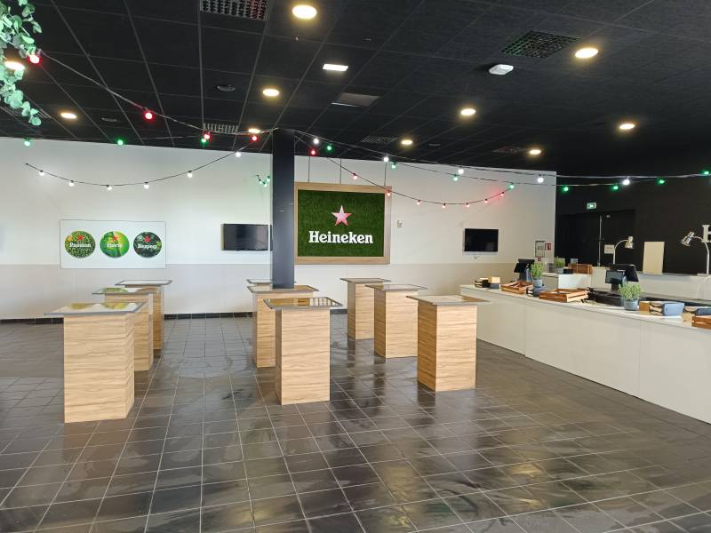Et en Février 2024, notre équipe réalise une décoration plus poussée, en usinant un comptoir complet de 8m de long en Dibond Effet bois ainsi qu'un set de 30 mange debout ornementé du logo de la marque de bière et des cadres en caisson effet bois + gazon avec incrustation de logo en PVC. De plus notre équipe de pose a finalisé ce chantier en procédant à la pose de guirlande d'ampoules lumineuses peintes aux couleurs rouge et vert du client.