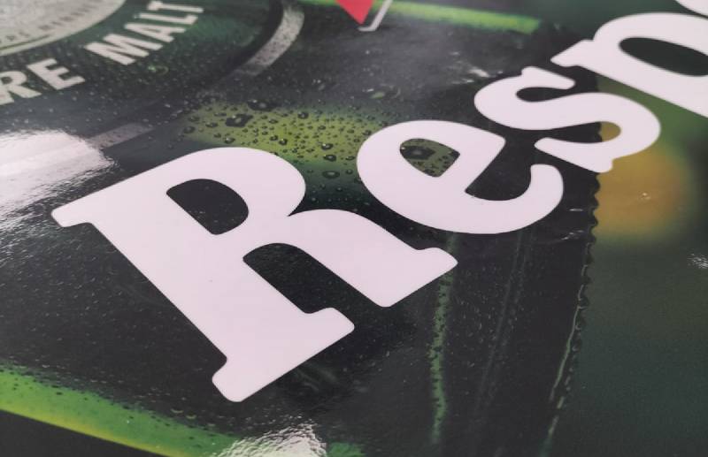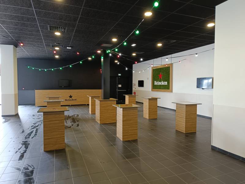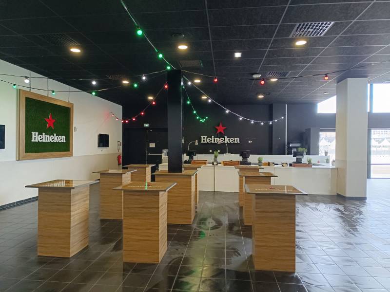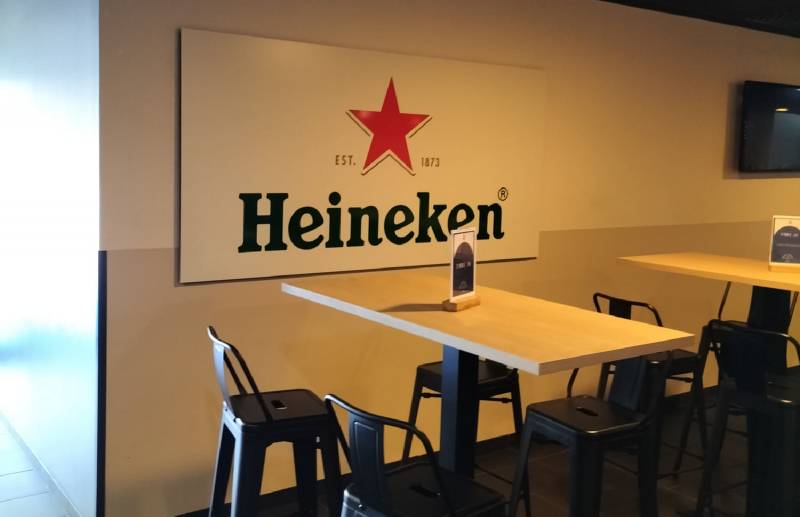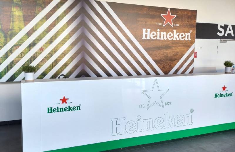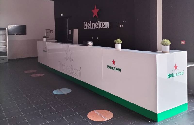 D'abord en Septembre 2023, Alliance enseignes a réalisé un ensemble d'habillage de comptoir de bar ainsi que de décorations murales en forme de cercle aux couleur de la marque Heineken Silver, soit en couleur blanc et vert.