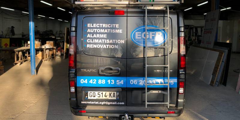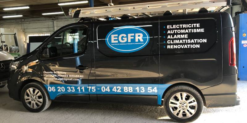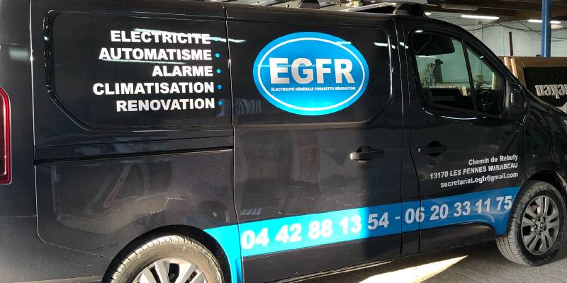 Notre équipe de graphiste et de pose de signalétique, a réalisé maquette et production pour le marquage véhicule de la société EGFR. Mêlant semi-covering et marquage simple, ce véhicule est à présent publicitairement parlant, très impactant permettant en coup d'œil de retenir les informations sur les métiers de cette société.
