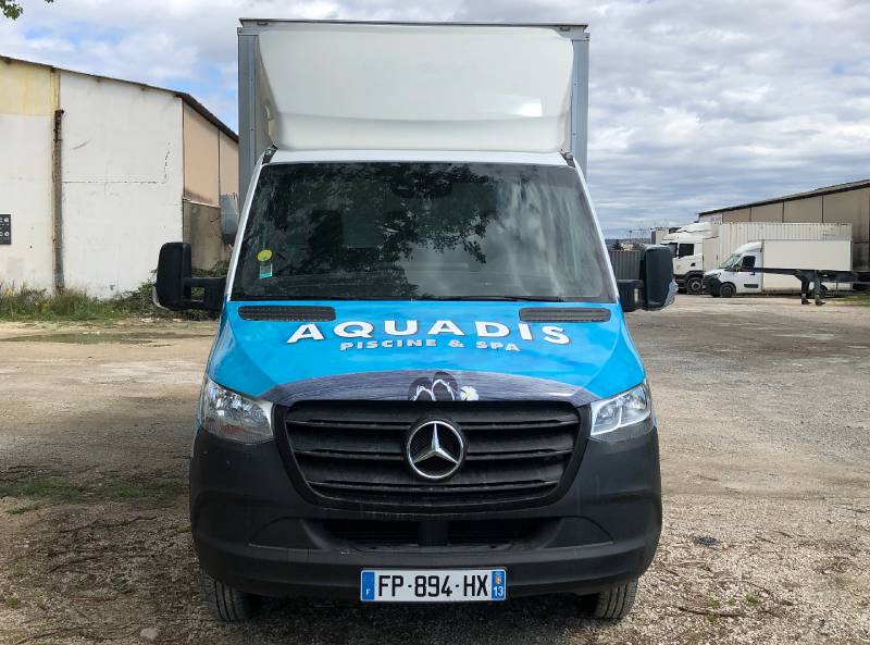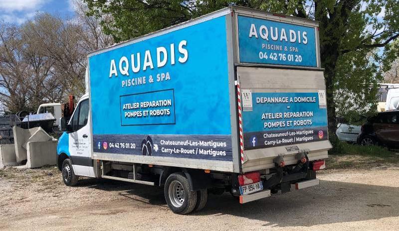 Pour ce projet, nos graphistes et poseurs ont réalisés la maquette ainsi que la pose d'un camion utilitaire pour la société AQUADIS PISCINE.